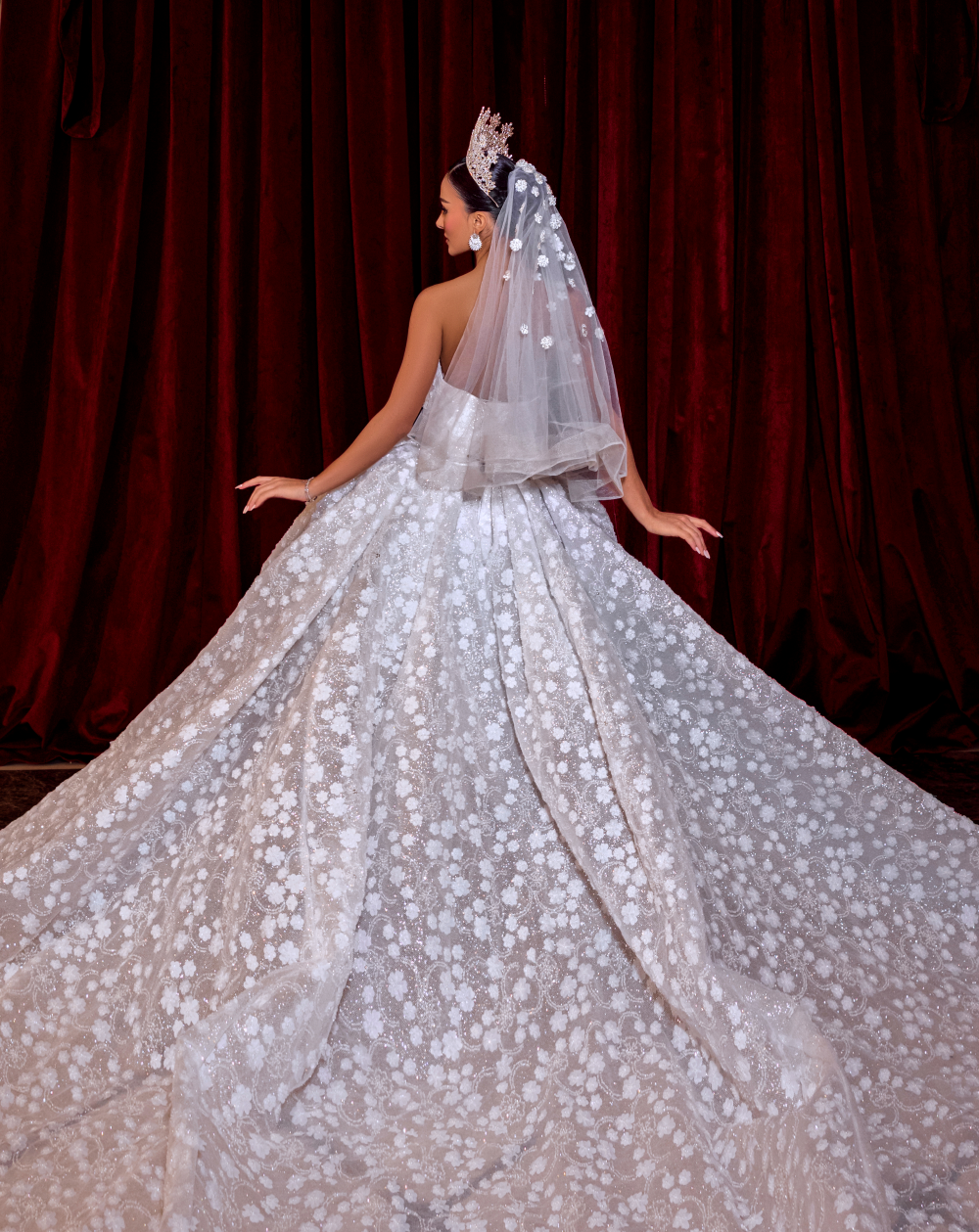 A queen carved from pure radiance, she stands crowned in brilliance. The voluminous skirt blooms with delicate floral textures, each petal kissed with soft silver light. The heart-shaped bodice glimmers with crystalline purity, while the ethereal veil cascades like a celestial waterfall. This gown is not crafted for a wedding alone, but for a realm a moment where grace becomes royalty.