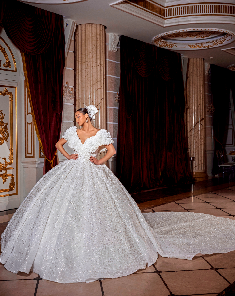 Enveloped in a celestial glow, she stands like a star descended from the heavens. Her gown, a luminous universe of white, shimmers with the quiet brilliance of gathered stardust. Sculpted floral waves crown the bodice like frozen clouds, while the sweeping skirt expands in regal harmony. With every step, she leaves behind a trail of radiance a woman who doesn’t simply walk, but illuminates.